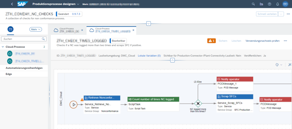 | Debug Production Processes | Mit dem Production Process Designer von SAP Digital Manufacturing können Spezialisten mit der Rolle Production_Engineer Cloud-basierte Produktionsprozesse nach der Verteilung debuggen. Diese Debugging-Funktion ermöglicht die schrittweise Überprüfung der Prozessausführung, um Probleme effizient zu identifizieren und zu beheben. Der Prozessdesigner unterstützt dabei, Breakpoints zu setzen und Eingabe- sowie Ausgabeparameter zu überprüfen, ohne die normale Ausführung der Produktionsprozesse zu beeinträchtigen. |